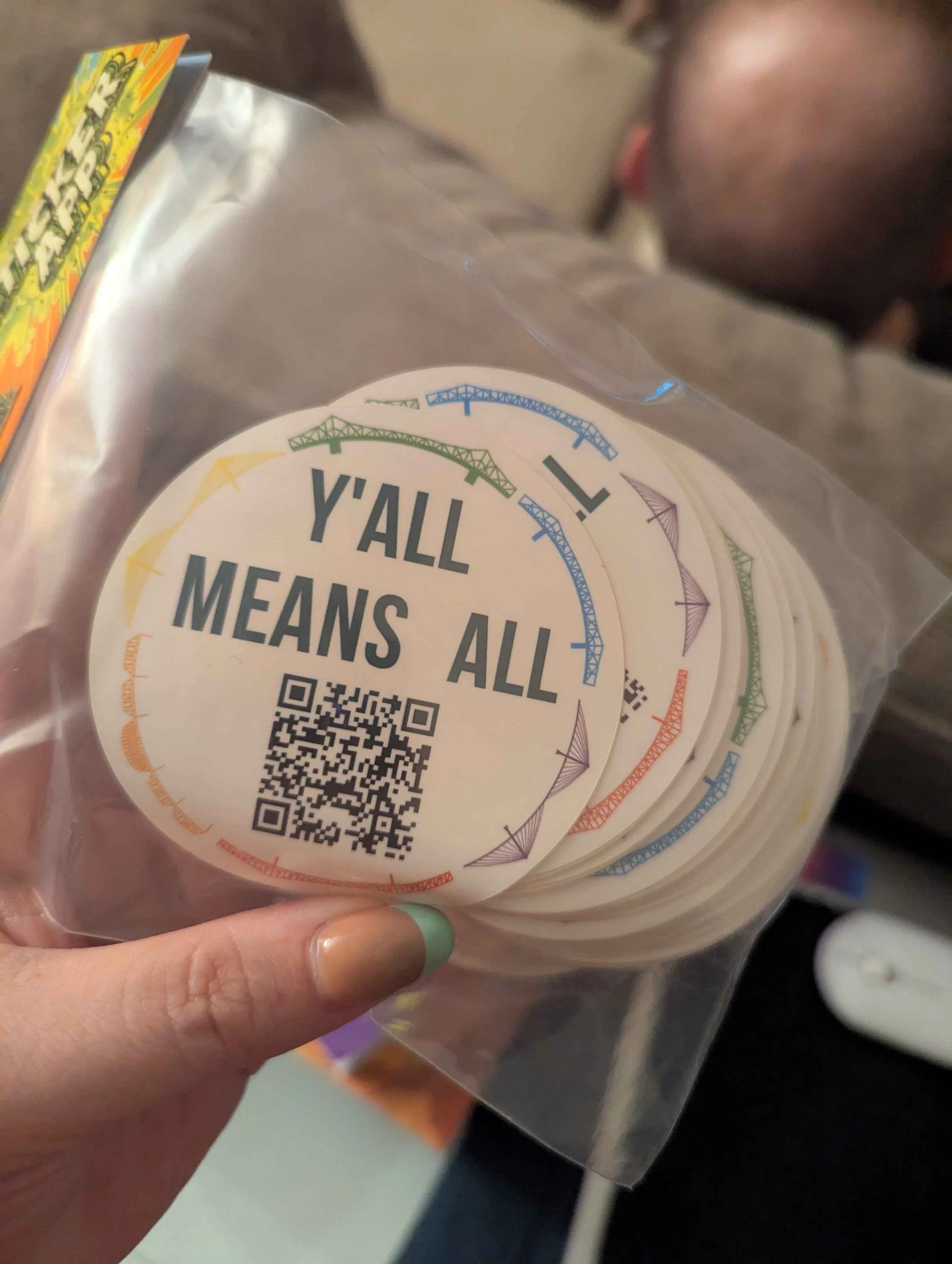 Every organization who signs the pledge receives a Y’all Means All decal for their door, is added to our online database (in progress), and are the first to be invited to new programs such as our Safe Zone Trainings and Pronoun Button Program.